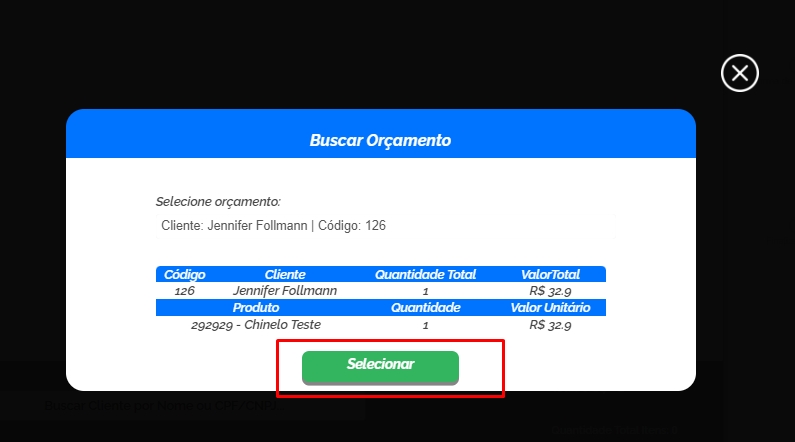 Localizado o Orçamento ou Pedido desejado, será apresentado os produtos vinculados a ele e clique em Selecionar