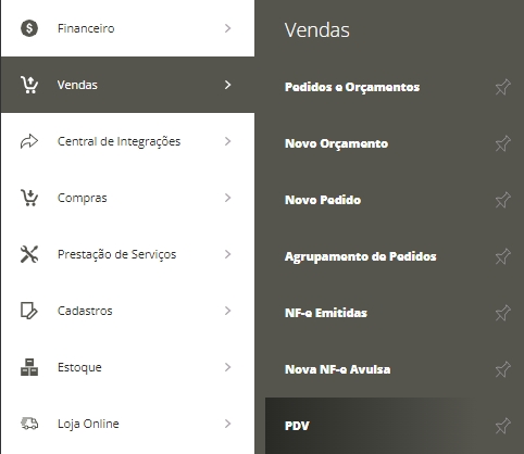 Acesse Menu Lateral Vendas e em seguida Submenu PDV