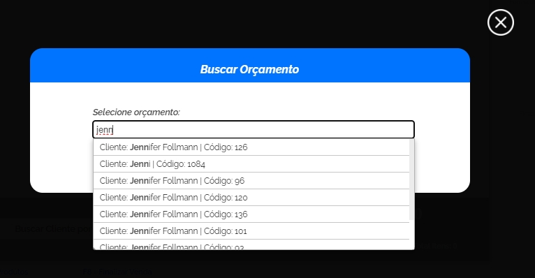 Nesta tela, você poderá estar buscando o Orçamento ou Pedido pelo nome do cliente ou até mesmo pelo Código do Pedido
