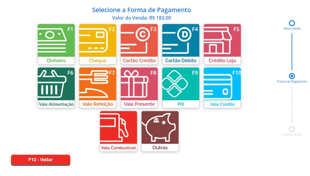 As formas de pagamento no PDV, são padrões, onde não será possível retirar, alterar ou adicionar novas formas de pagamento. A modalidade para cadastro de formas de pagamento se aplica somente em vendas realizadas por Pedidos e Orçamentos ou em lançamentos financeiros.