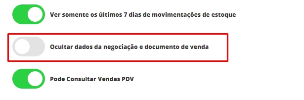 Logo, vá até a seção Restrições de Acesso e localize a opção Ocultar dados da negociação e documento de venda, onde após desabilitar a configuração será necessário clicar em Salvar para validação de dados.